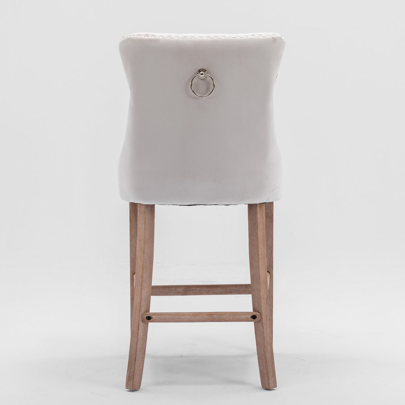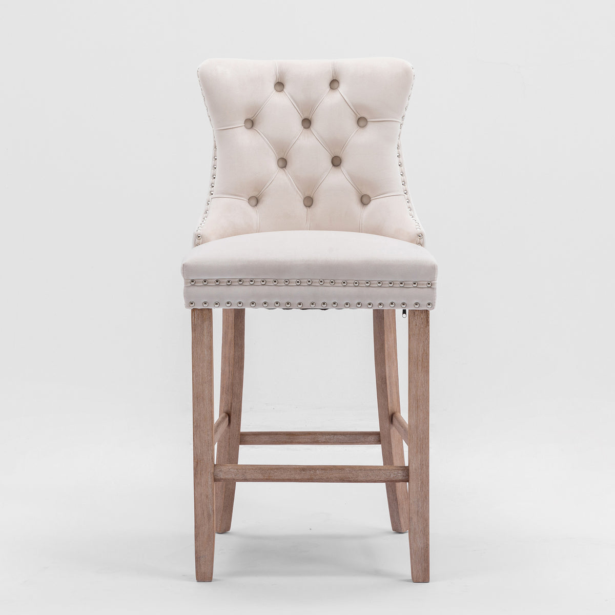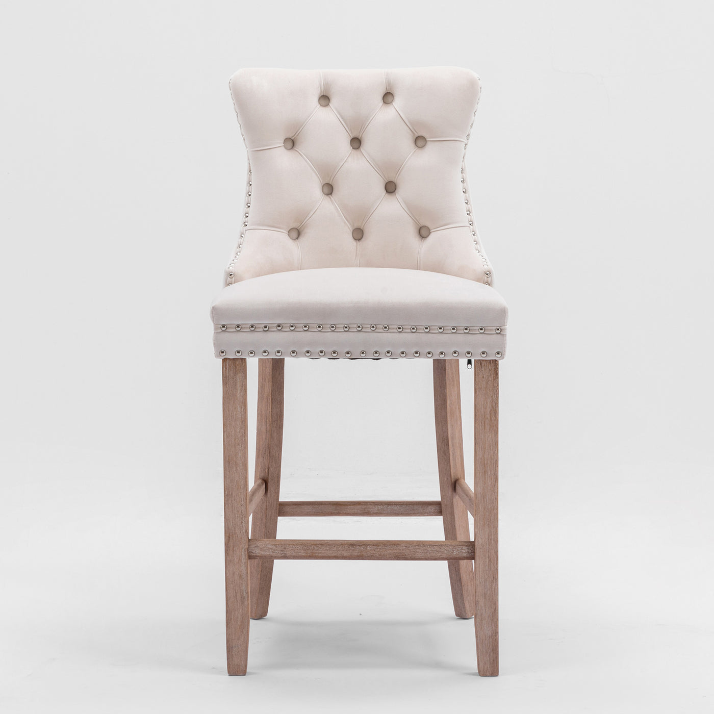 LuxeBar Set of 2 Beige Velvet Bar Stools, Button Tufted with Wooden Legs