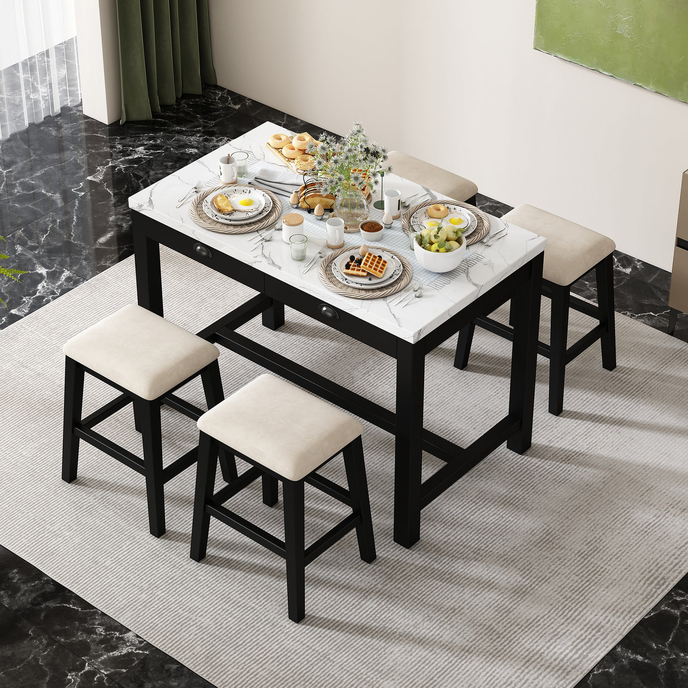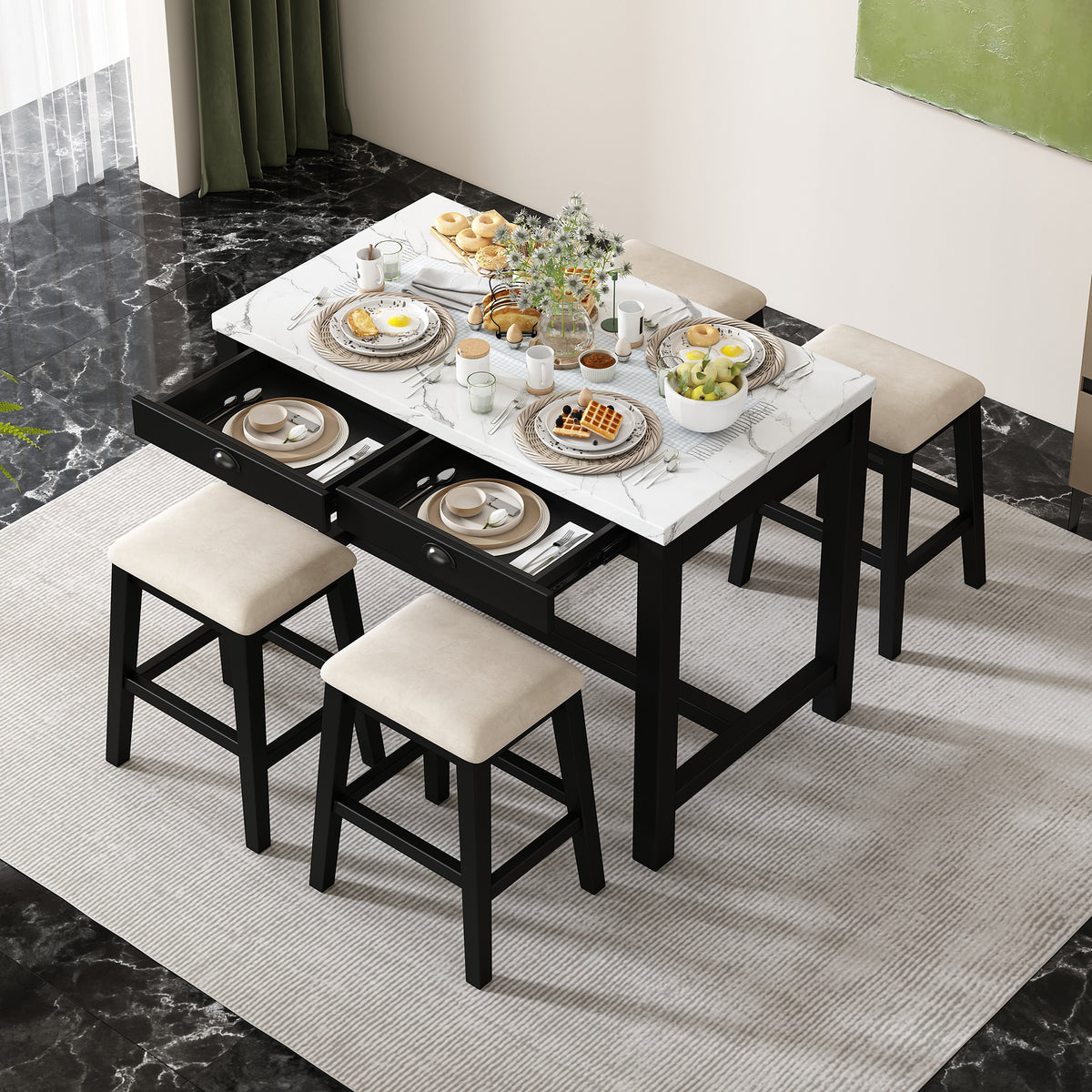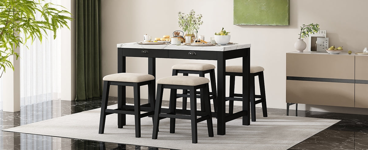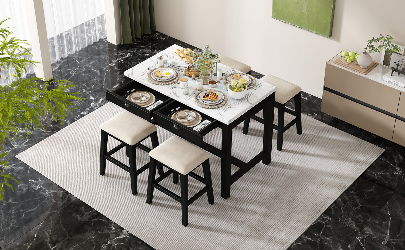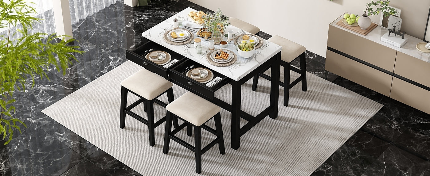 - Superior Quality: This dining table set for 4 is built to last with a solid wood frame of acacia and rubber wood and high-quality materials. The tabletop of faux marble stickers is resistant to scratches and stains, making it a practical choice for families and frequent entertainers alike. The cushioned stools are upholstered in velvet fabric, offering long-lasting comfort and style. The table holds up to 550 lbs with each drawer holding up to 11 lbs, and each stool supports up to 440 lbs.