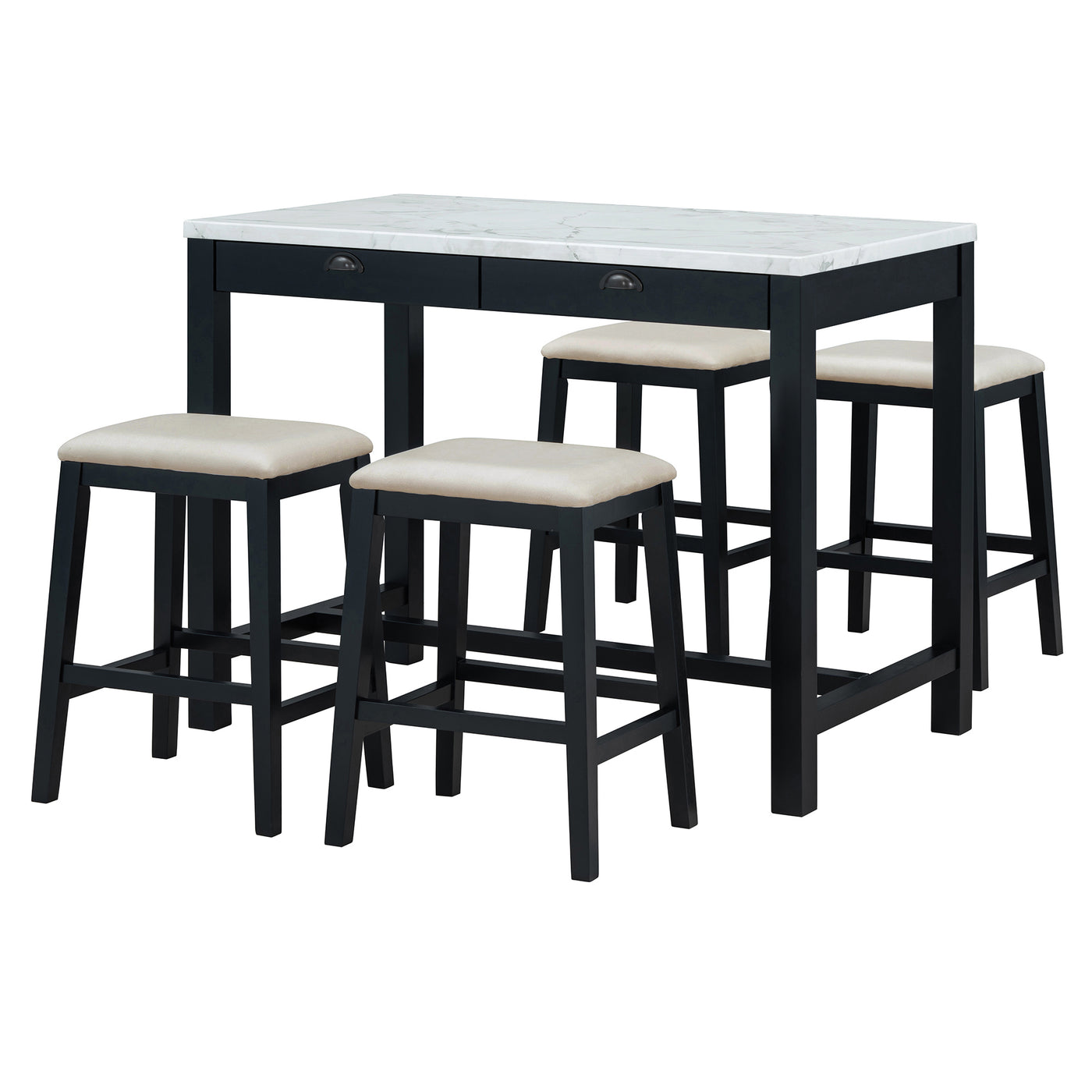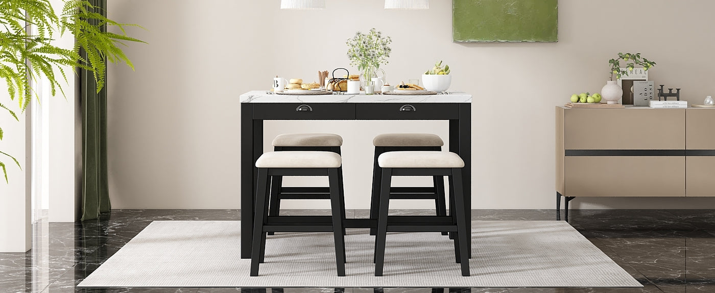 - Modern Bar Table Set: This dining table set for 4 showcases a harmonious blend of modern and classic design elements. The faux marble stickered tabletop and dark wood finish provide a timeless appeal that seamlessly fits into both contemporary and traditional settings. The simple yet elegant structure offers a versatile aesthetic, making it an excellent choice for various interior styles, from cozy home kitchens to trendy urban apartments. It’s available in two colors: Black and Walnut.