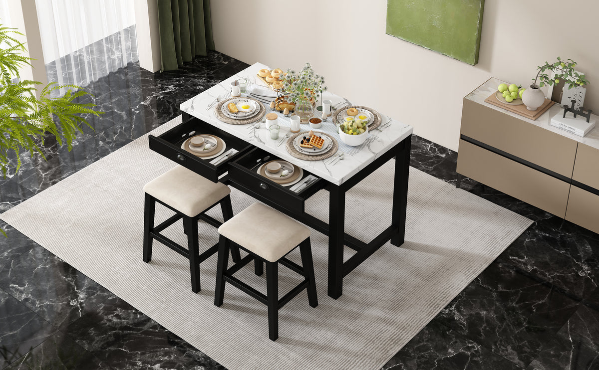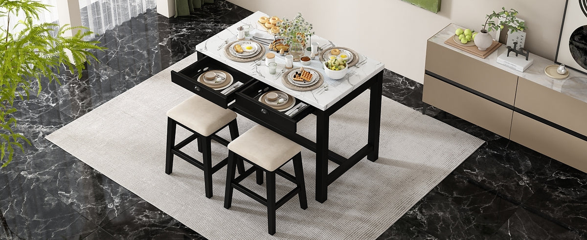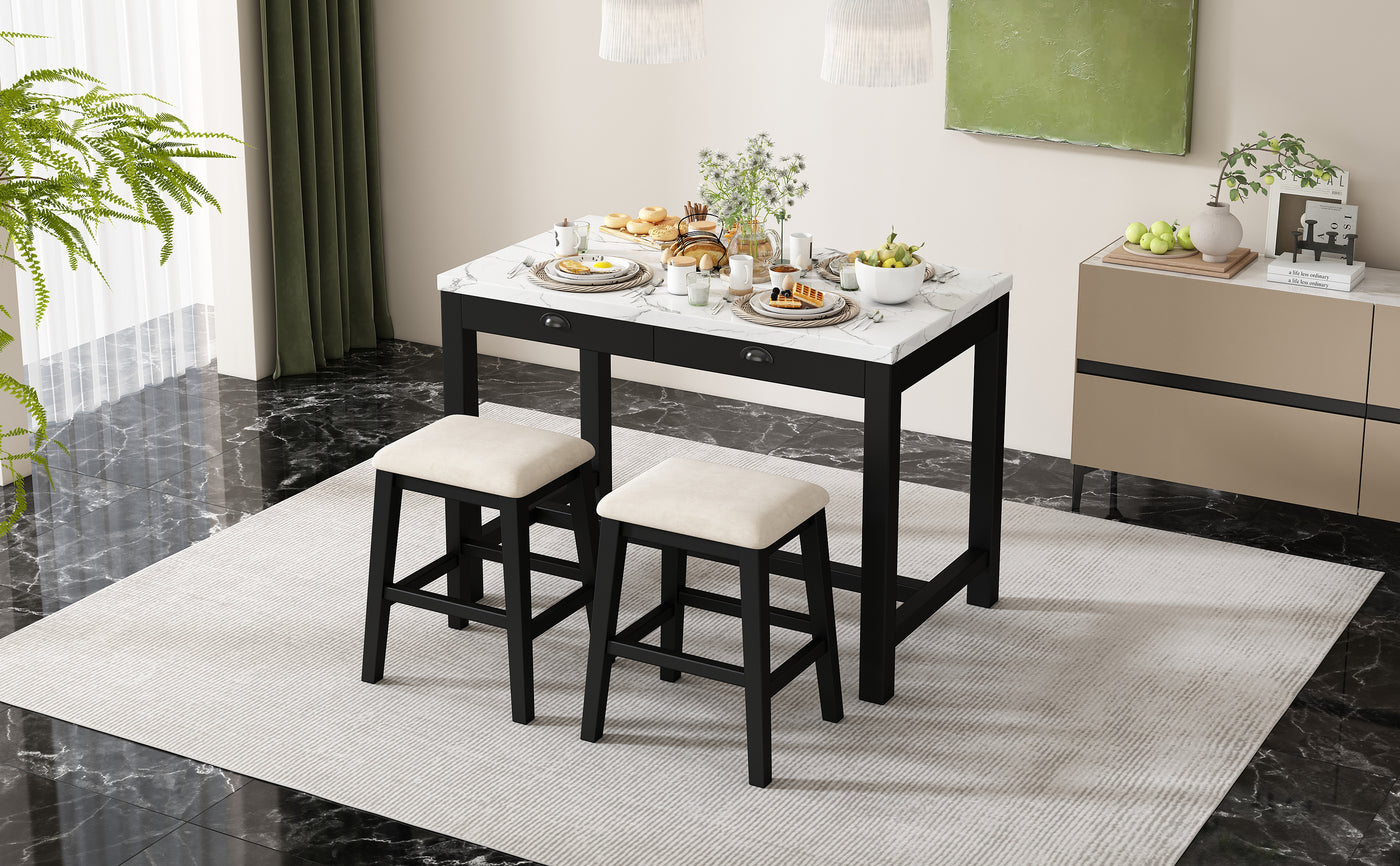 - Stunning Details: The attention to detail in this bar table set is evident in its thoughtfully crafted features. The smooth, faux marble sticker surface not only adds a touch of sophistication but also provides a durable, easy-to-clean space for dining or casual gatherings, while the hidden storage drawers add a functional element that enhances the set's practicality. The bar stools are designed with cushioned seats, offering comfort without compromising on style.