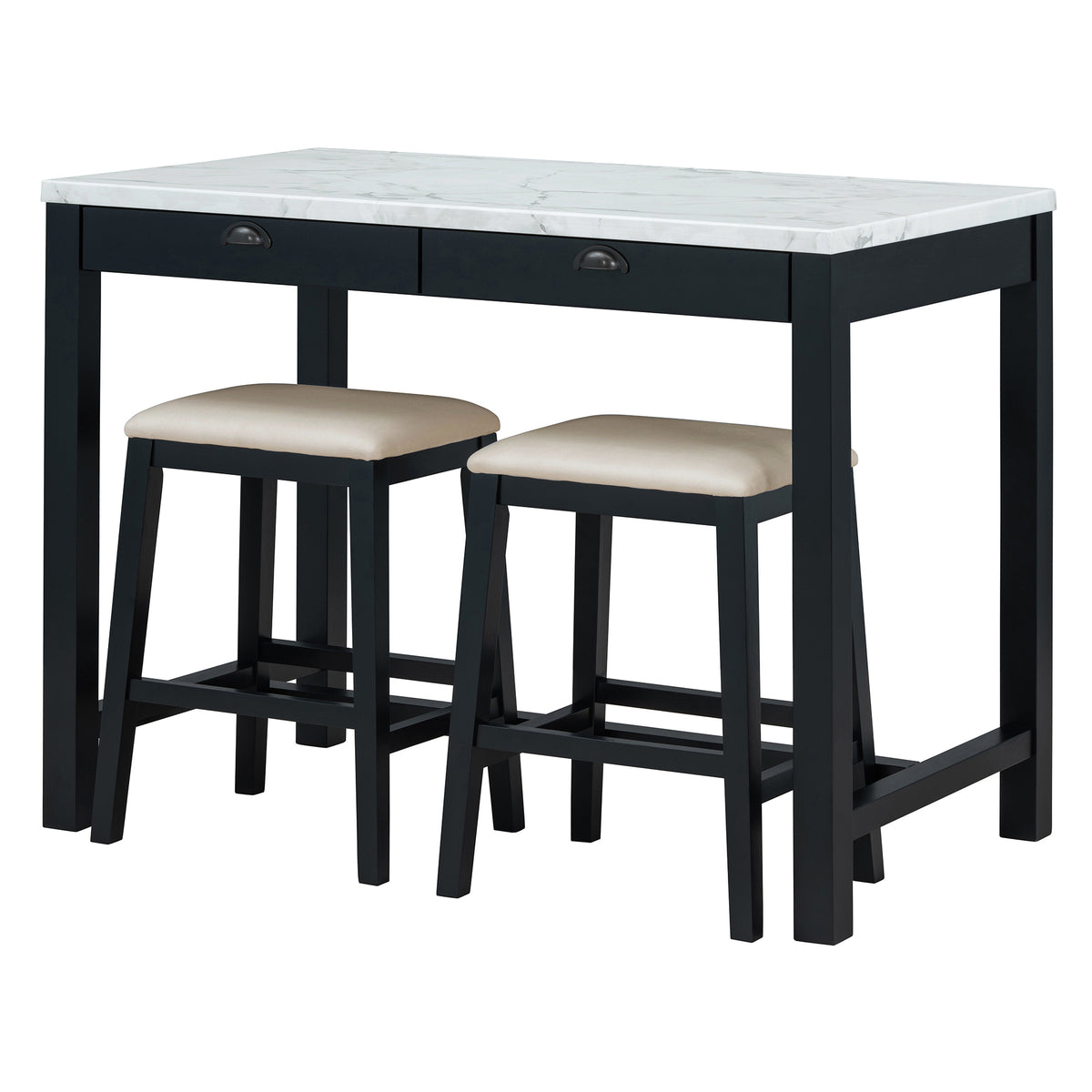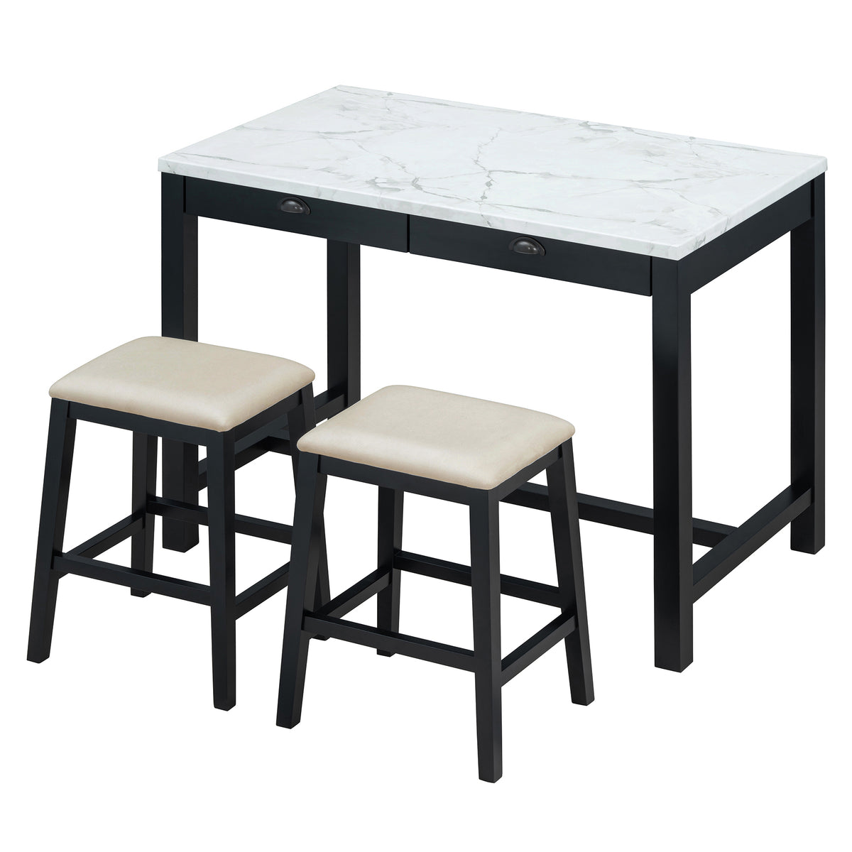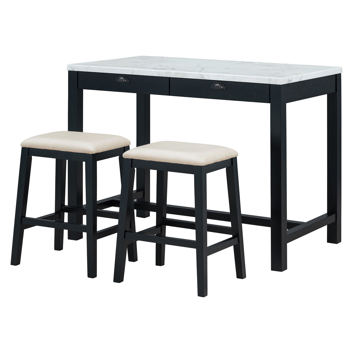- Stunning Details: The attention to detail in this bar table set is evident in its thoughtfully crafted features. The smooth, faux marble sticker surface not only adds a touch of sophistication but also provides a durable, easy-to-clean space for dining or casual gatherings, while the hidden storage drawers add a functional element that enhances the set's practicality. The bar stools are designed with cushioned seats, offering comfort without compromising on style.