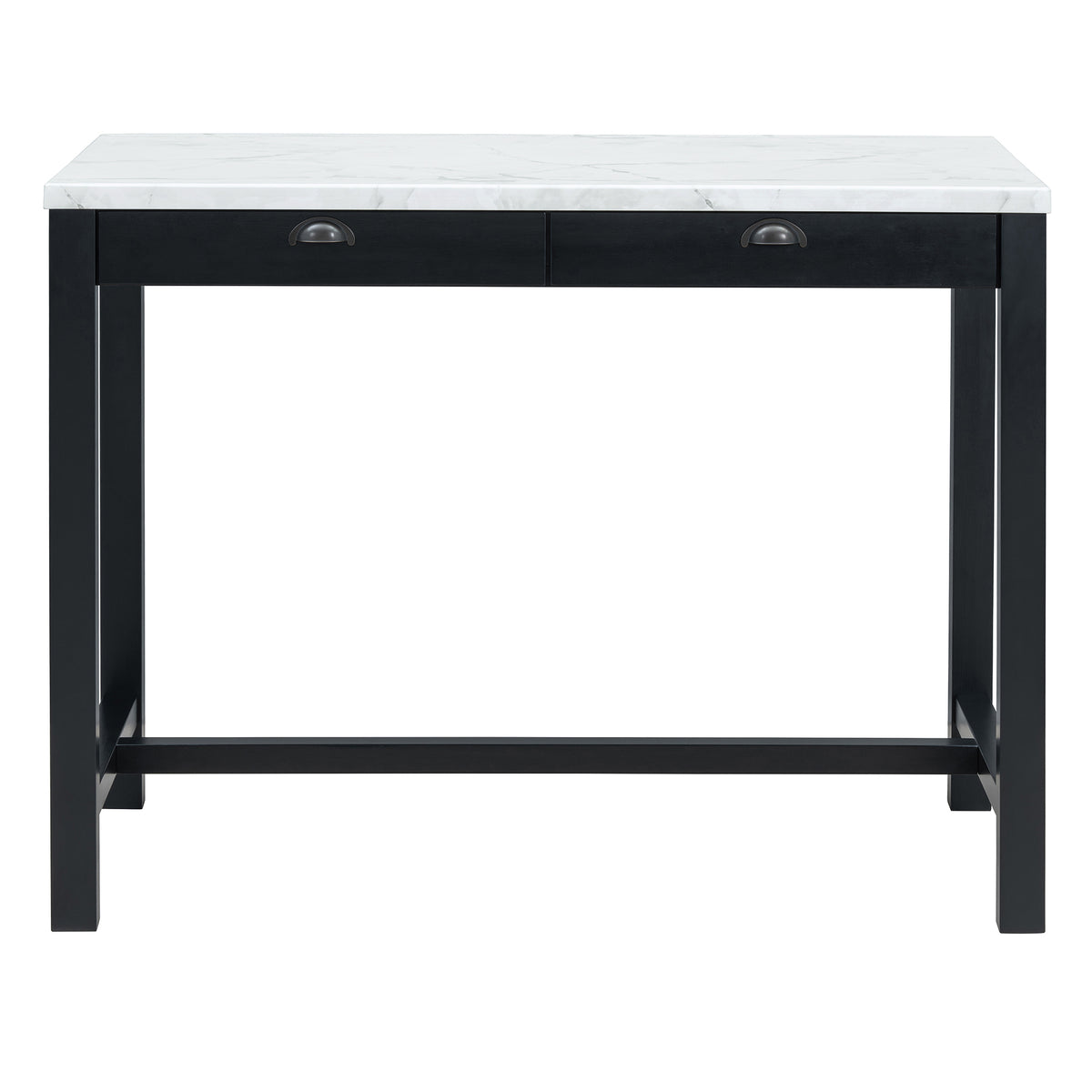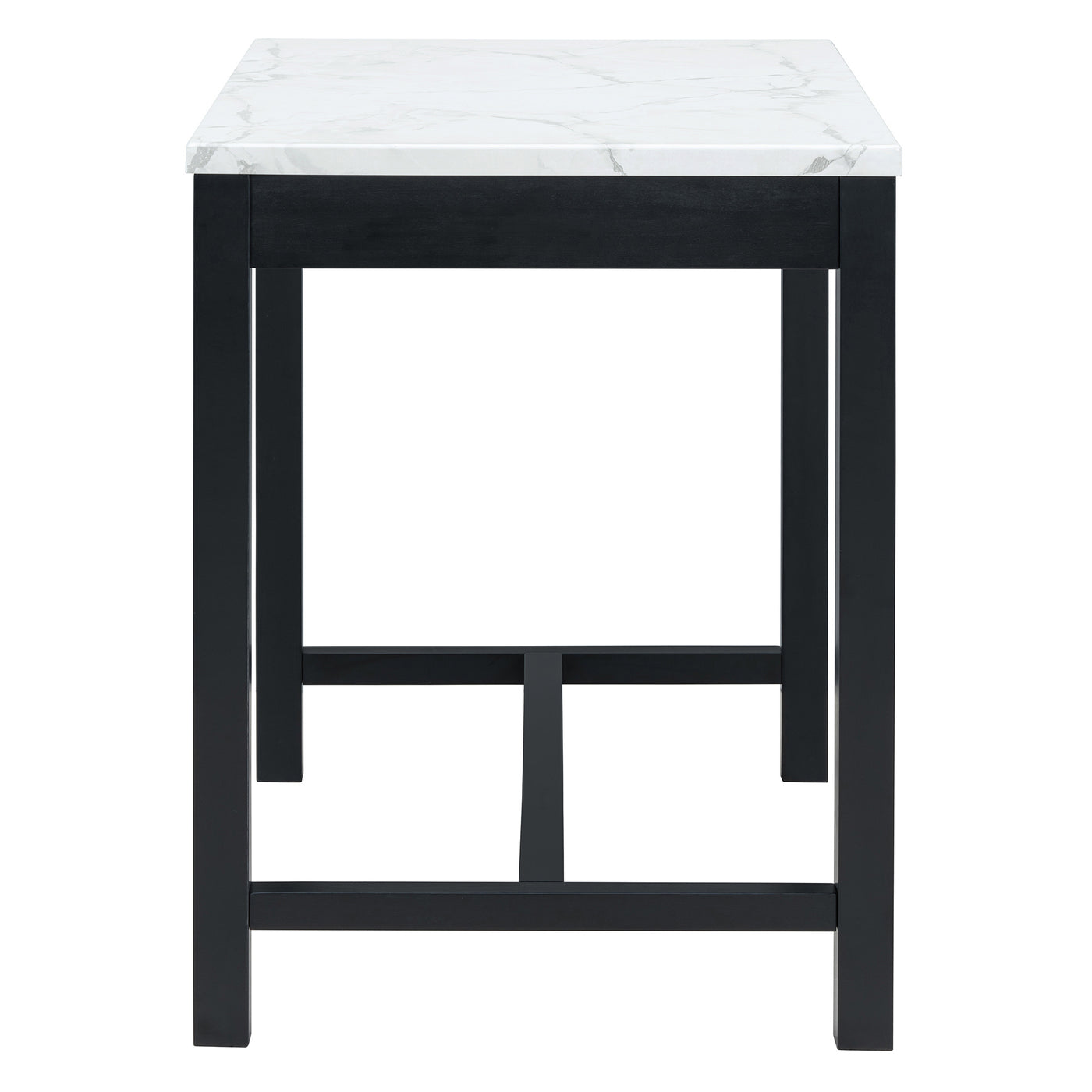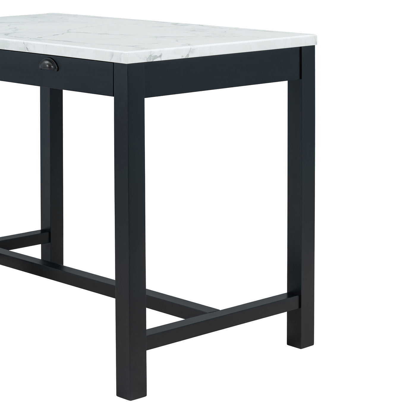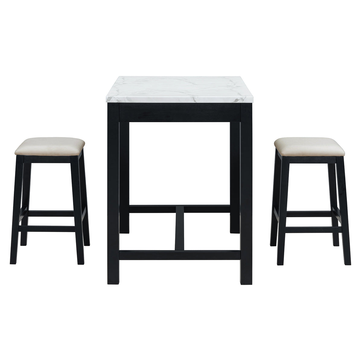 This bar table set showcases a harmonious blend of modern and classic design elements. The faux marble stickered tabletop and dark wood finish provide a timeless appeal that seamlessly fits into both contemporary and traditional settings. The simple yet elegant structure offers a versatile aesthetic, making it an excellent choice for various interior styles, from cozy home kitchens to trendy urban apartments. It’s available in two colors: Black and Walnut.