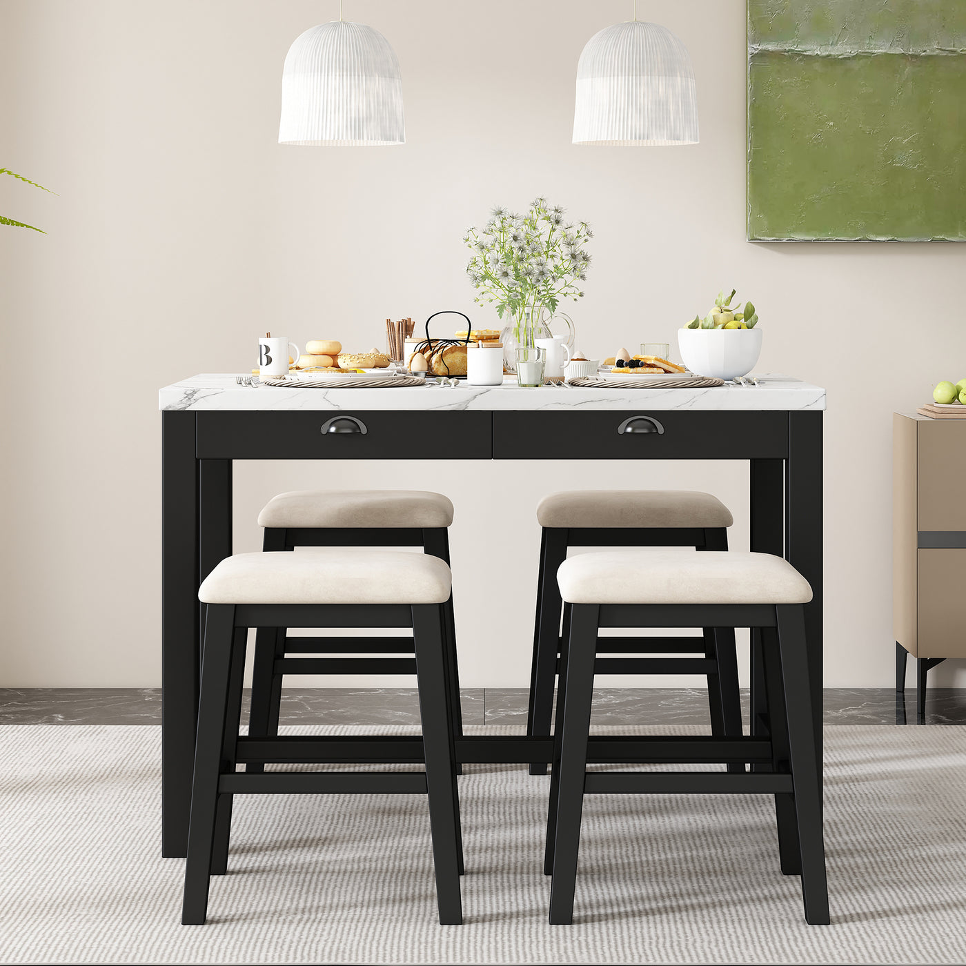 This bar table set is more than just a place to eat, it's a multifunctional solution for small spaces. The two built-in drawers provide convenient storage for utensils, napkins, or other dining essentials, keeping your dining area clutter-free. Additionally, the set is designed to accommodate up to four stools, making it perfect for small gatherings with two stools or expanding seating when needed with four stools, so you can choose from these two combinations as you want.