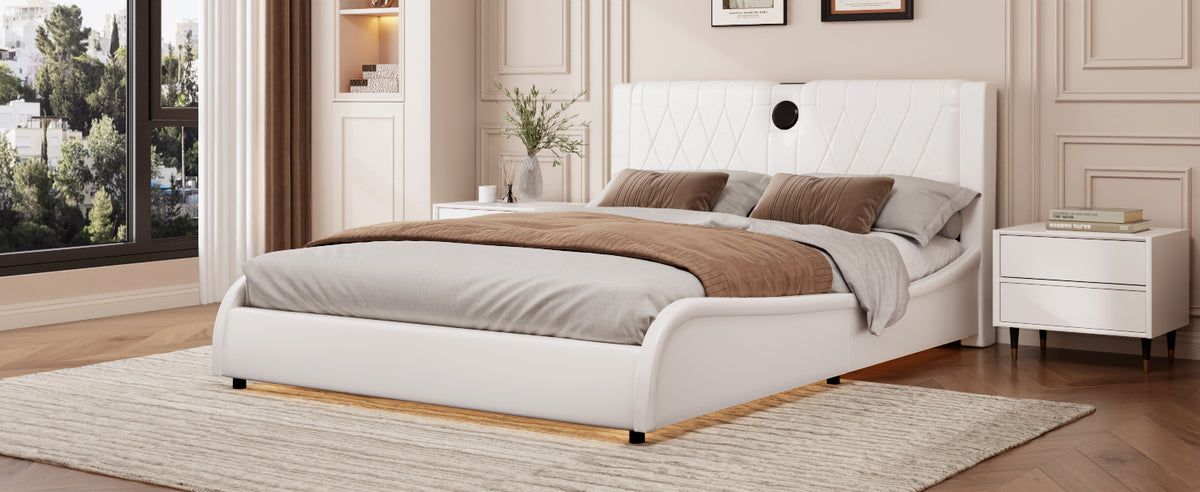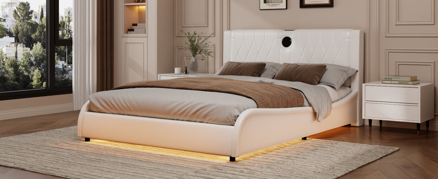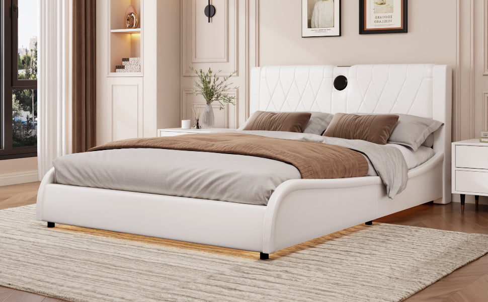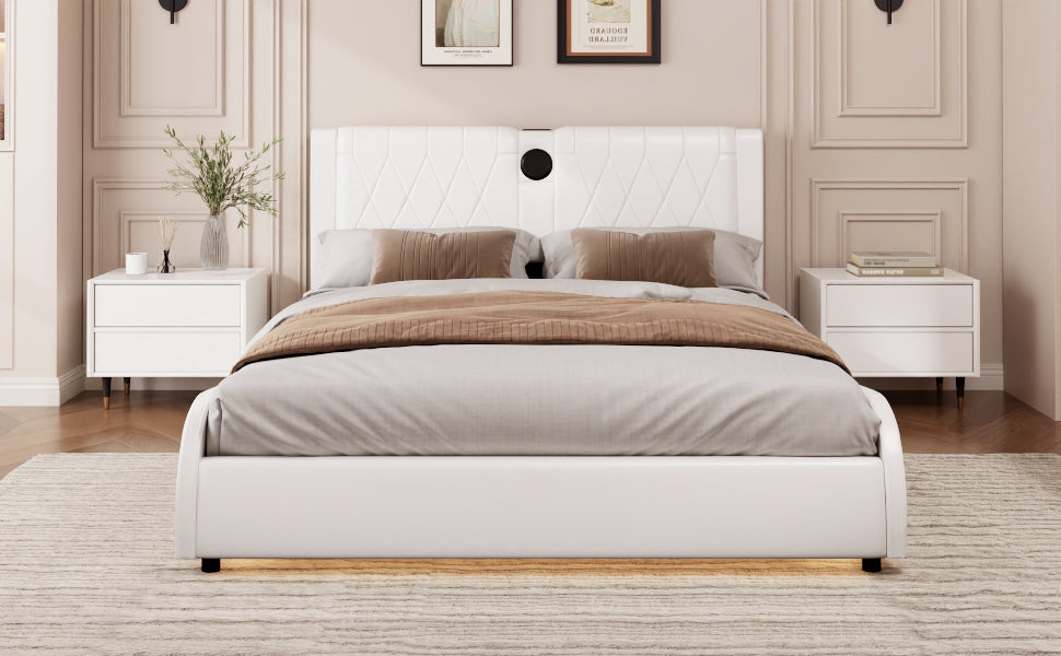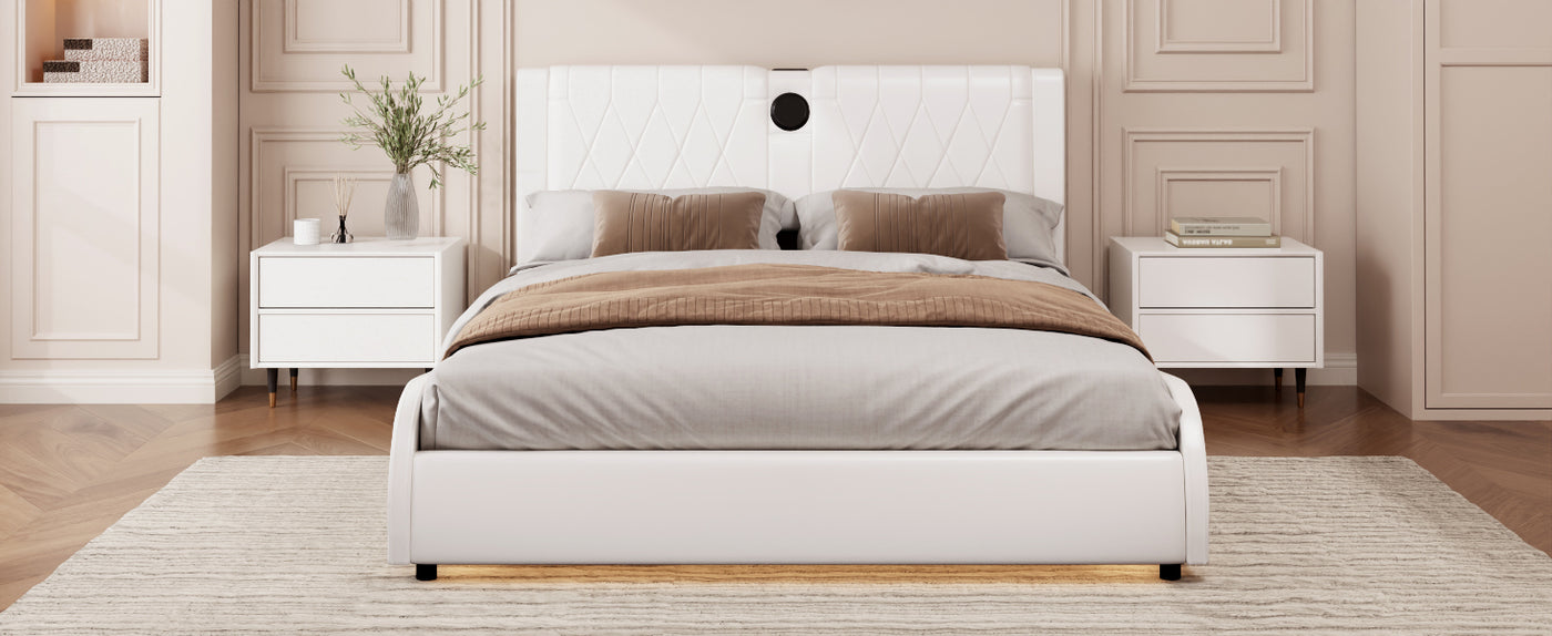 Transform your bedroom into a futuristic haven with our RGB LED Leather Upholstered Bed. Featuring a luxurious thickened PU leather headboard and integrated Bluetooth speakers, this bed offers both comfort and high-tech convenience. The adjustable RGB LED lights set the mood, while the Bluetooth speakers let you enjoy music wirelessly. Easy to clean and maintain, this bed is designed for those who want a stylish yet functional addition to their bedroom