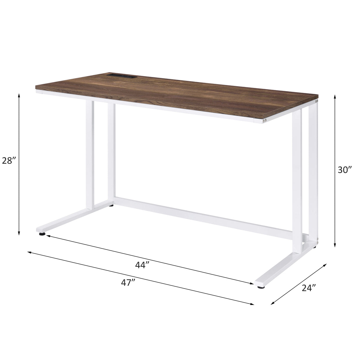 This writing desk features a knock-down design for easy assembly and convenient transportation, making it suitable for various room settings. Its rectangular shape provides a spacious work surface for writing, studying, or working on a laptop, while the built-in USB port and plug offer convenient access for charging electronic devices, and the open base design ensures ample legroom and space underneath for added comfort and versatility, accommodating ergonomic seating and additional storage options.