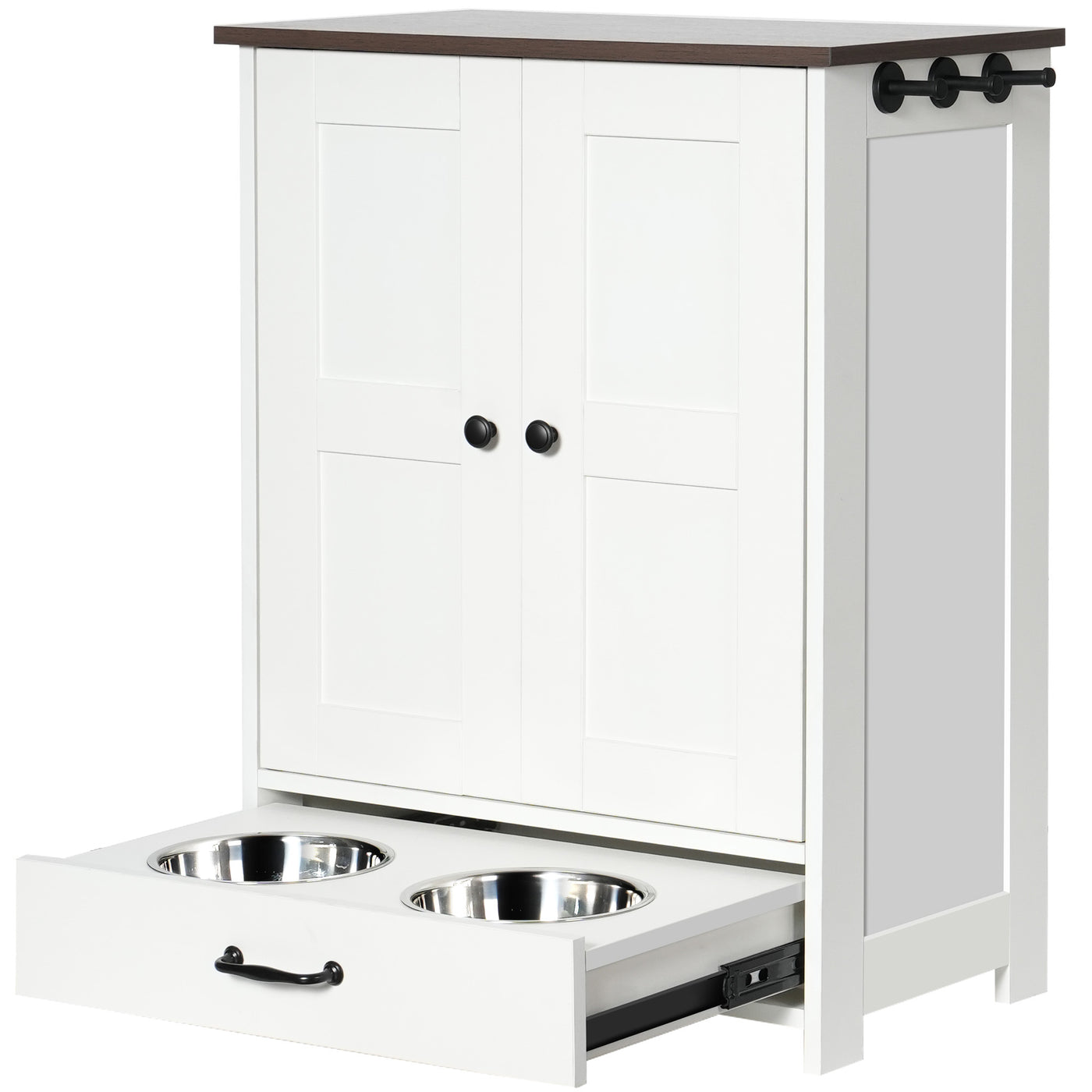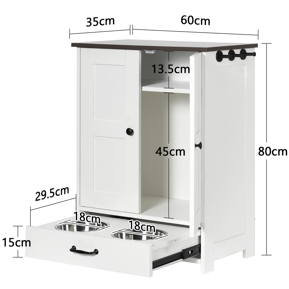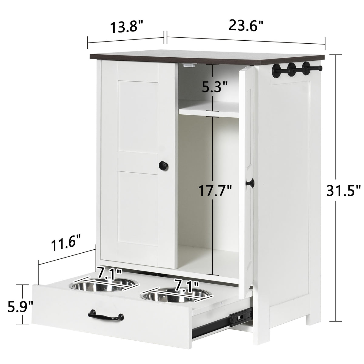 - 4,Dimensional parameters: Made of particle board, this dog feeding station is safe, durable and easy to clean. The bottom sliding drawer is 6 inches tall and the design helps reduce pressure on your pet's neck and back and is suitable for both dogs and cats. Product Dimensions: Entire cabinet dimensions: 23.6' x 13.77' x 31.5' (L x W x H), Dog bowl: 8.5' x 2.15'.