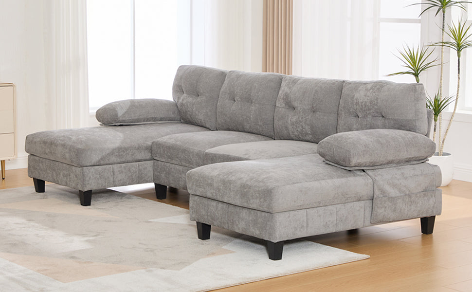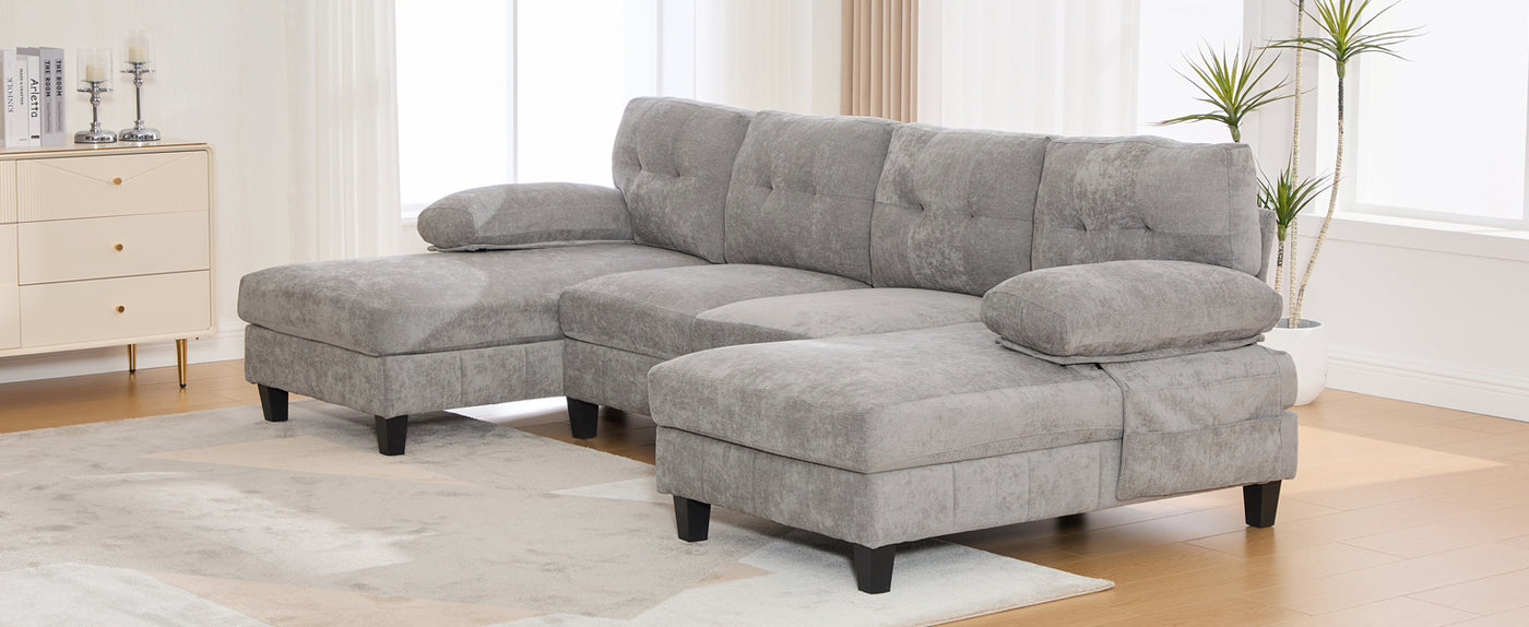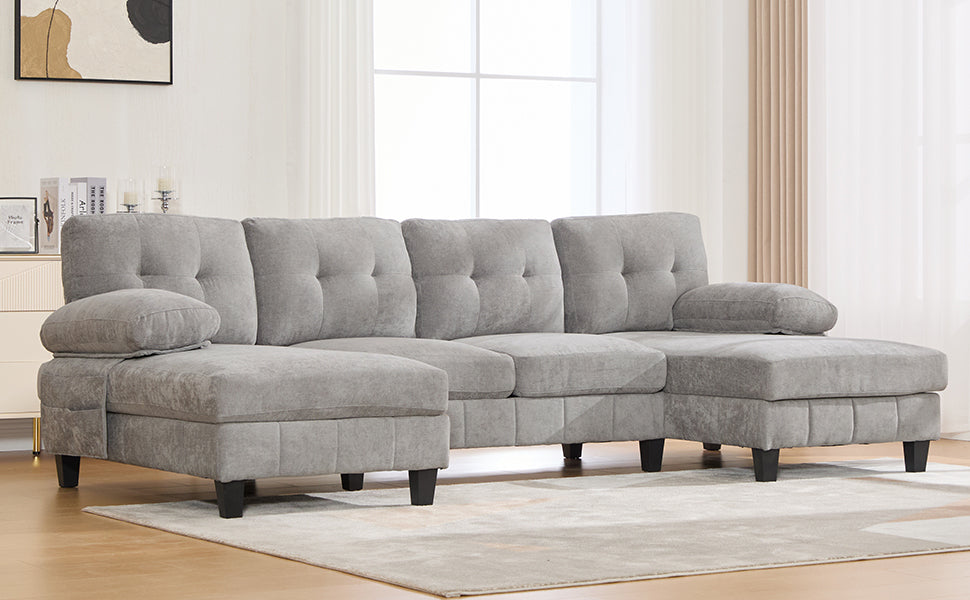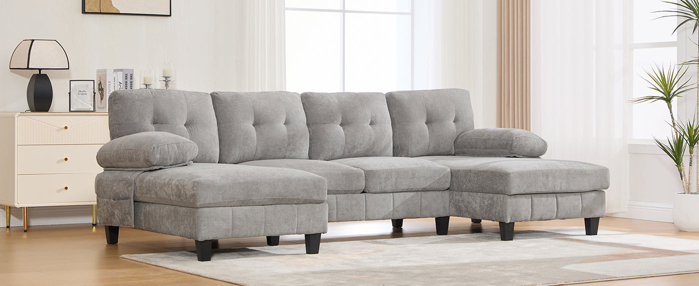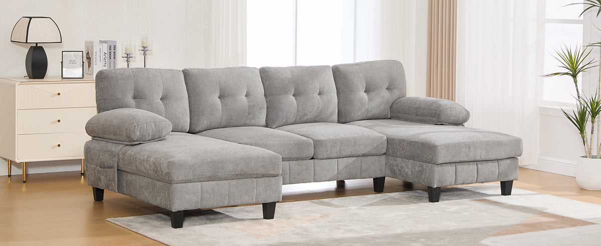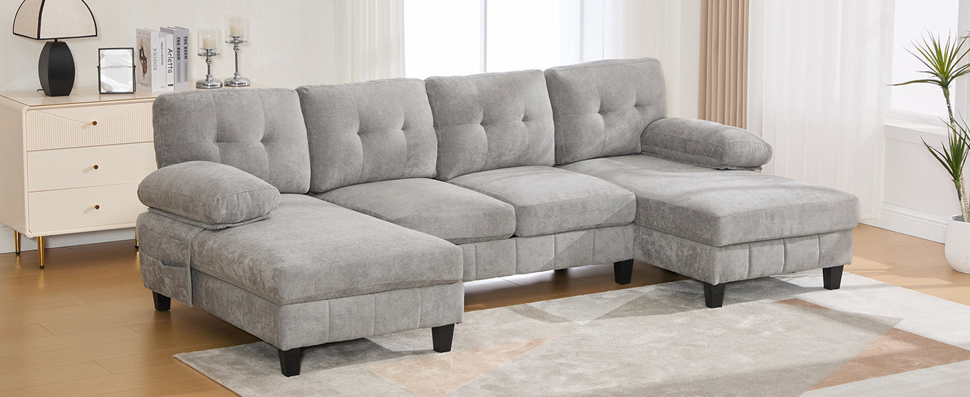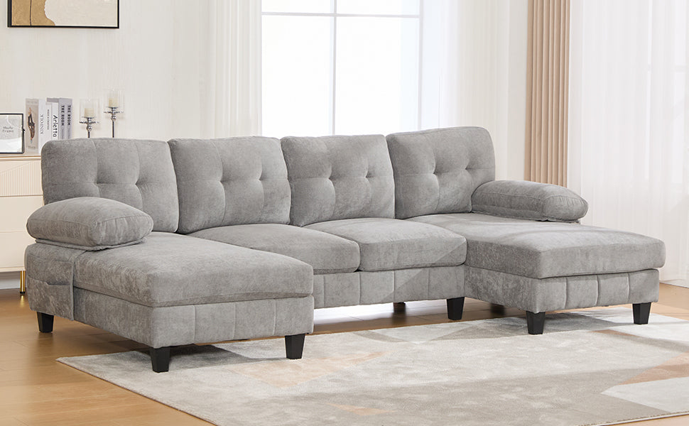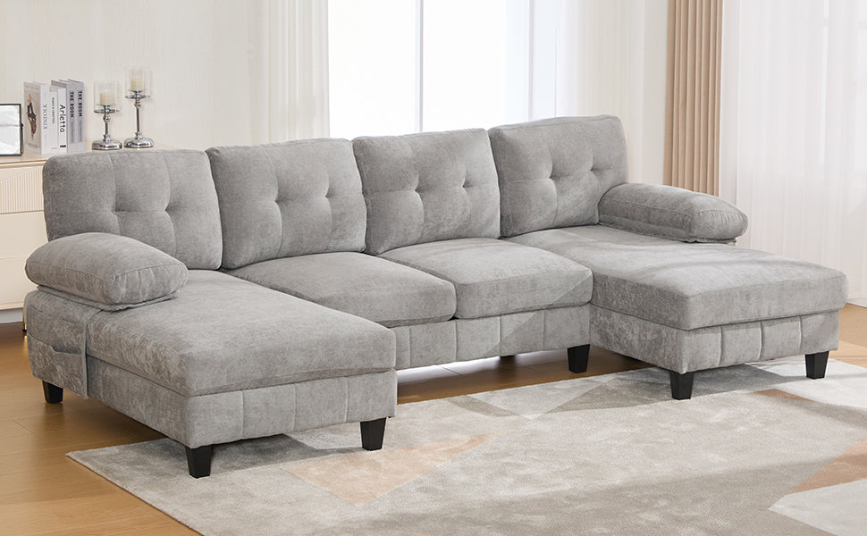 This U-shaped sectional sofa combines spacious comfort with smart functionality and stylish design. Featuring dual chaise lounges, it offers ample room for relaxation and gatherings. Thoughtful additions like side storage pockets and plush armrest pillows enhance everyday convenience and comfort. The elegant tufted backrest and soft chenille fabric create a modern yet inviting look, making it a perfect centerpiece for any living space.