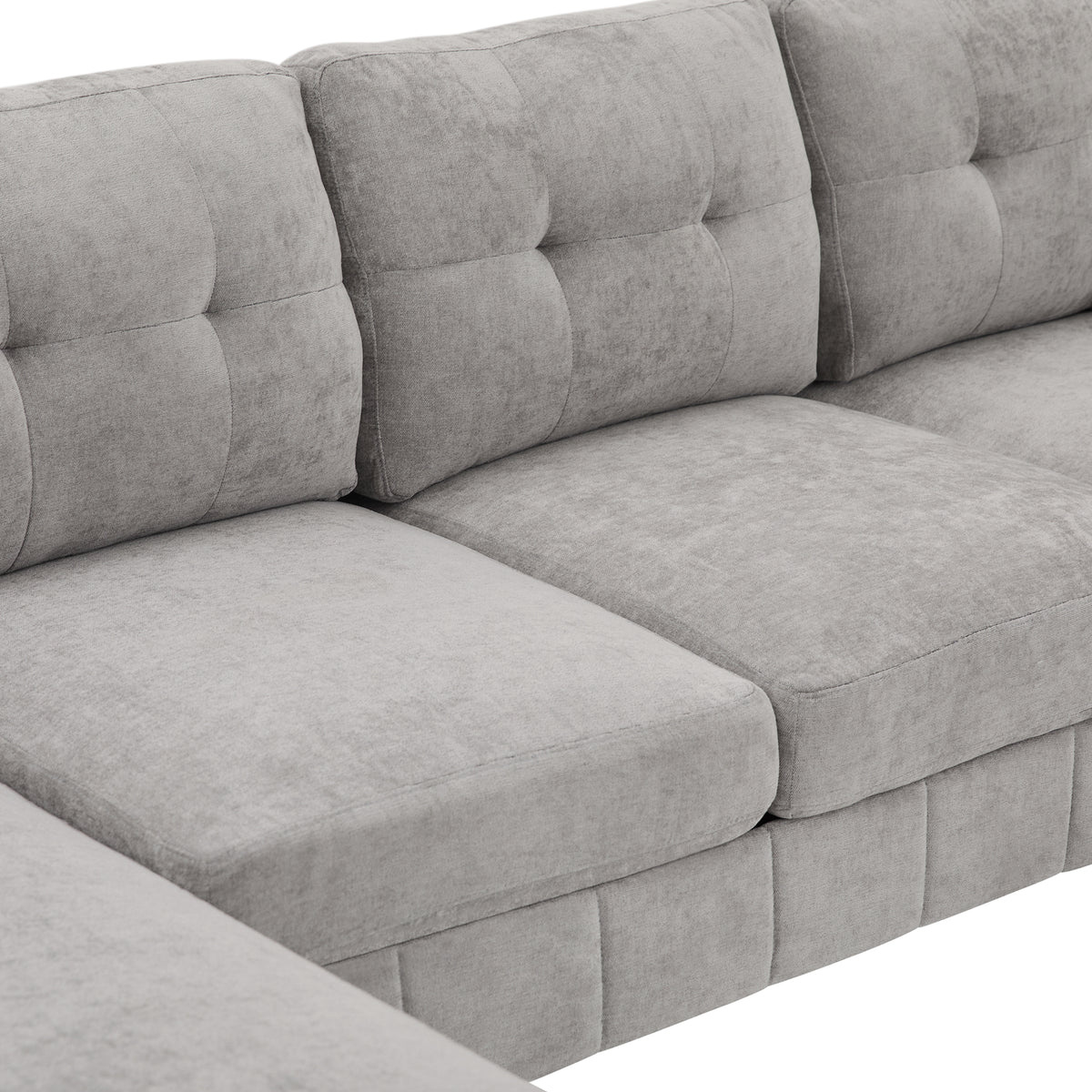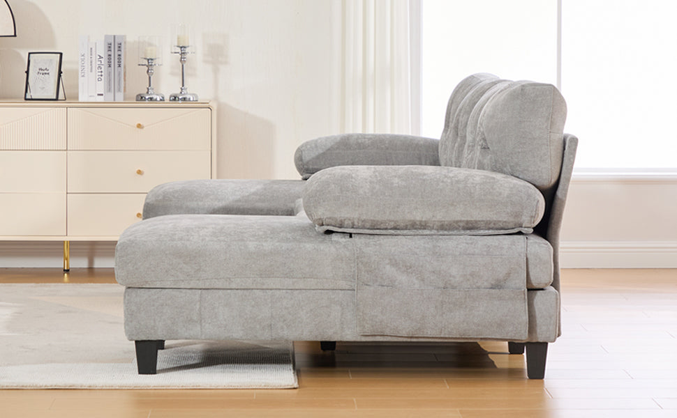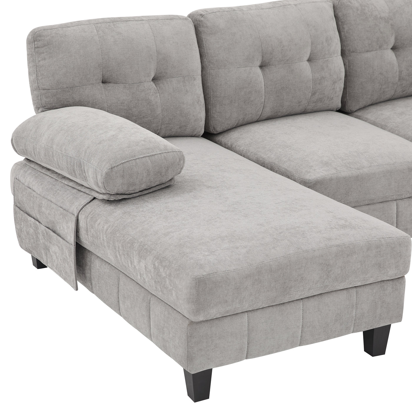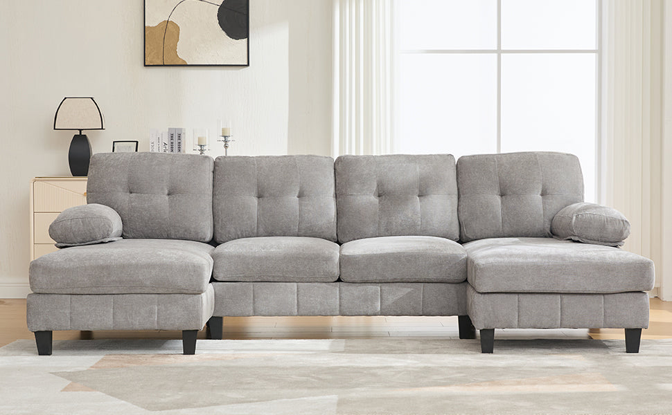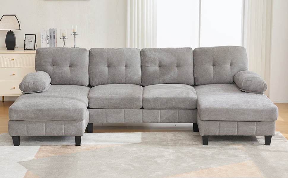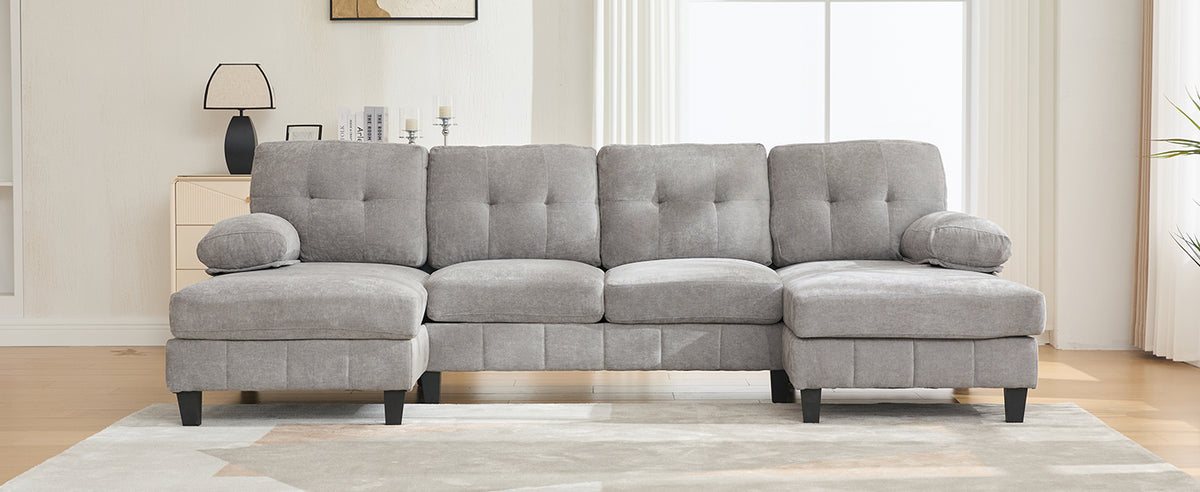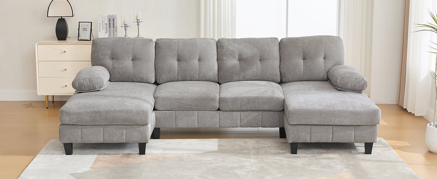 This U-shaped sectional sofa combines spacious comfort with smart functionality and stylish design. Featuring dual chaise lounges, it offers ample room for relaxation and gatherings. Thoughtful additions like side storage pockets and plush armrest pillows enhance everyday convenience and comfort. The elegant tufted backrest and soft chenille fabric create a modern yet inviting look, making it a perfect centerpiece for any living space.