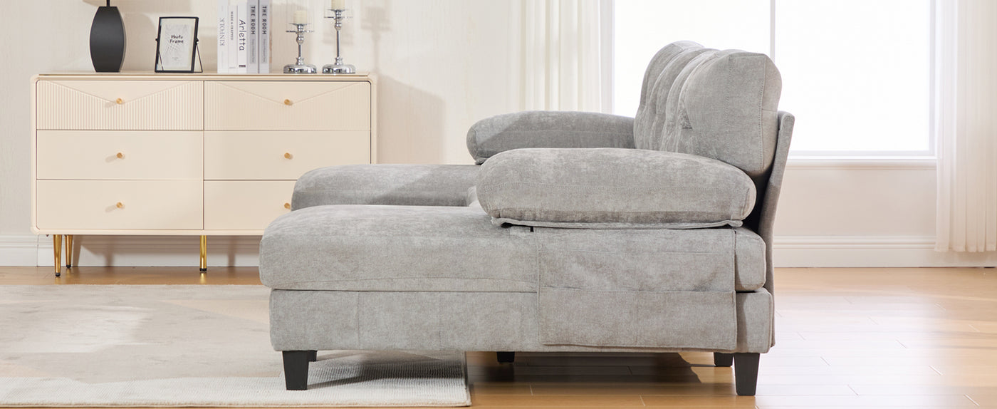 Both ends of the sofa feature convenient side storage pockets, perfect for keeping remote controls, phones, magazines, and other small essentials close at hand. This thoughtful design helps maintain a tidy and organized living space, reducing clutter and enhancing convenience.