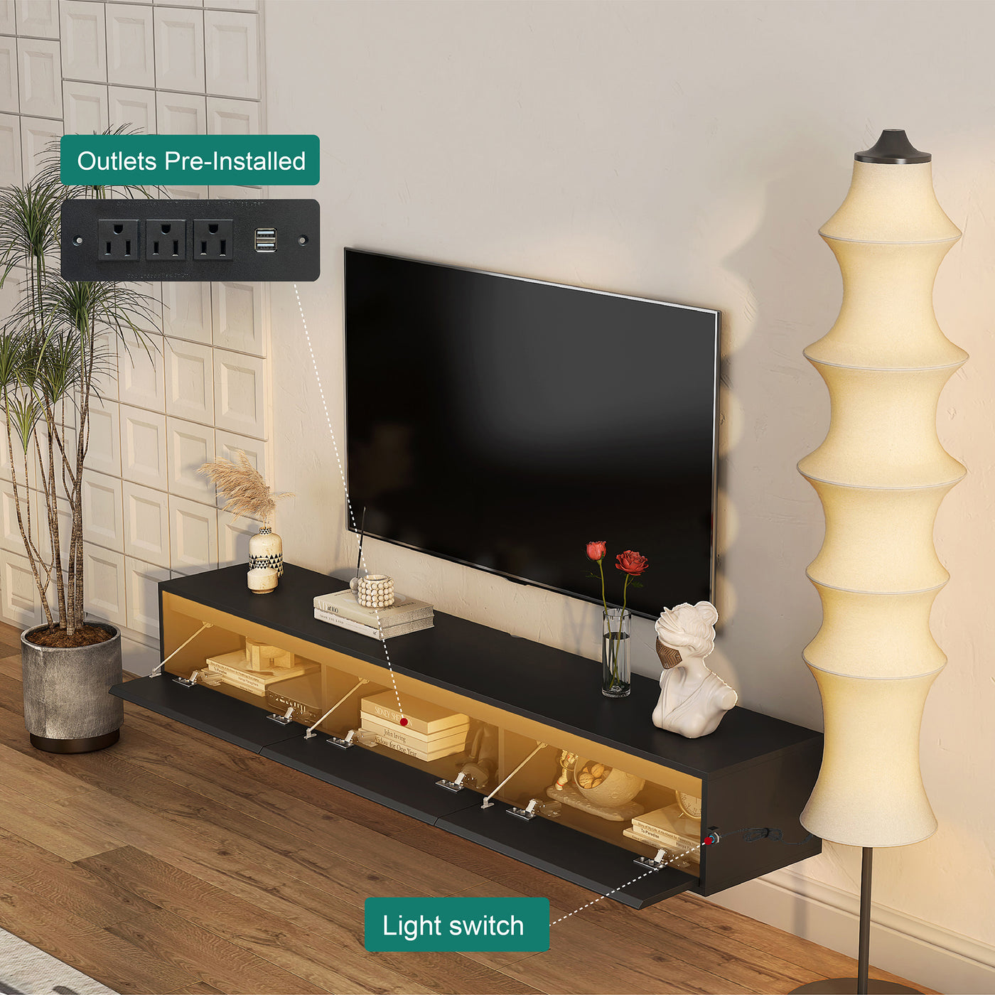 - Equipped with 3 standard plugs and 2 USB ports, the floating TV stand provides convenient power charging for your TV, DVD, WiFi router and more