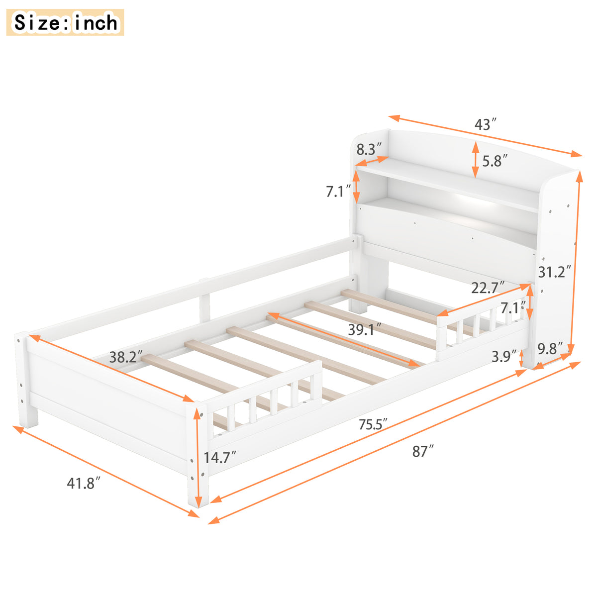 Wood Twin Size Platform Bed with Built-in LED Light, Storage Headboard and Guardrail, White