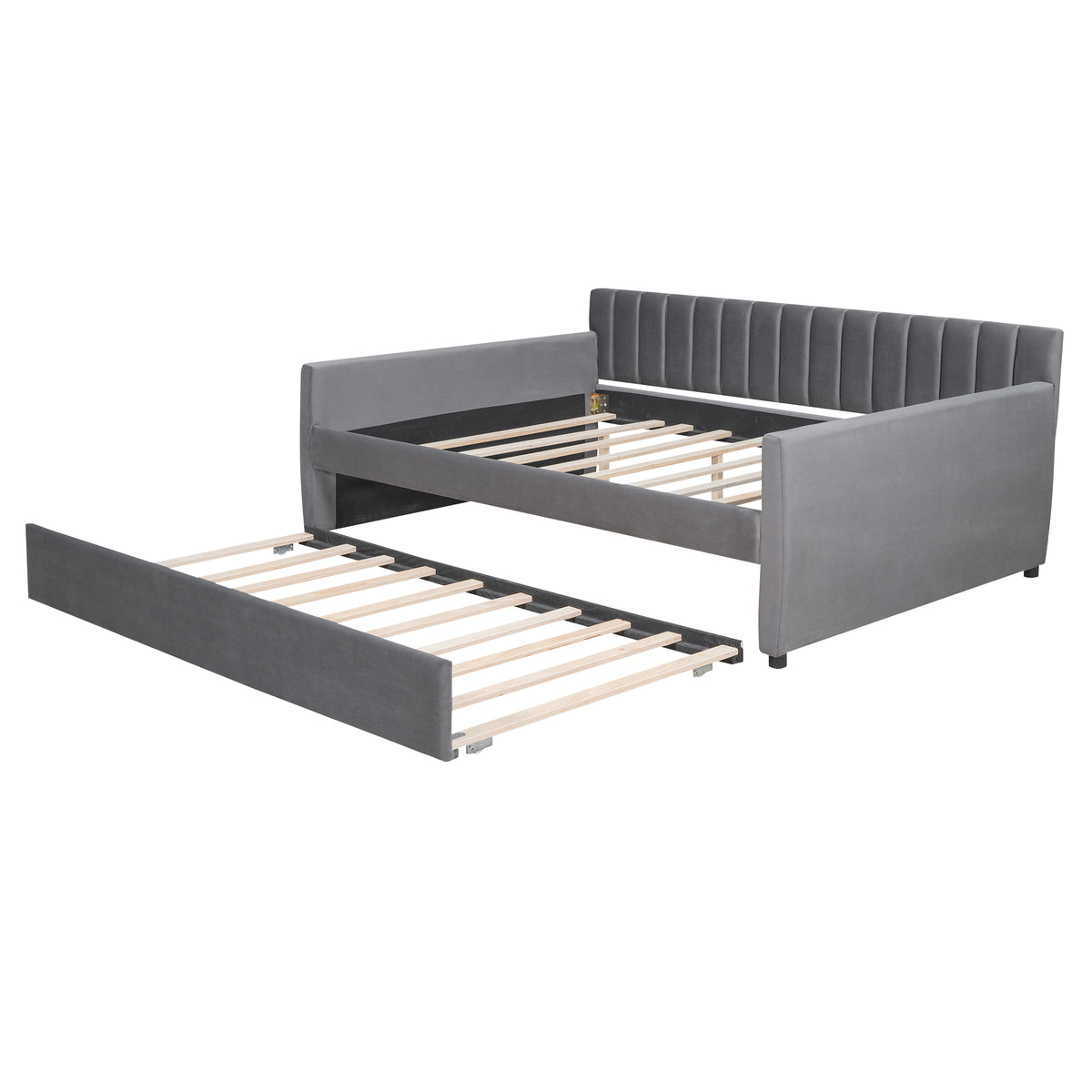 - [No Box Spring needed] This daybed frame comes with sturdy wooden slats. Mattress is not included. A comfy velvet fabric and two armrests that bring you and your family a cozy feeling.